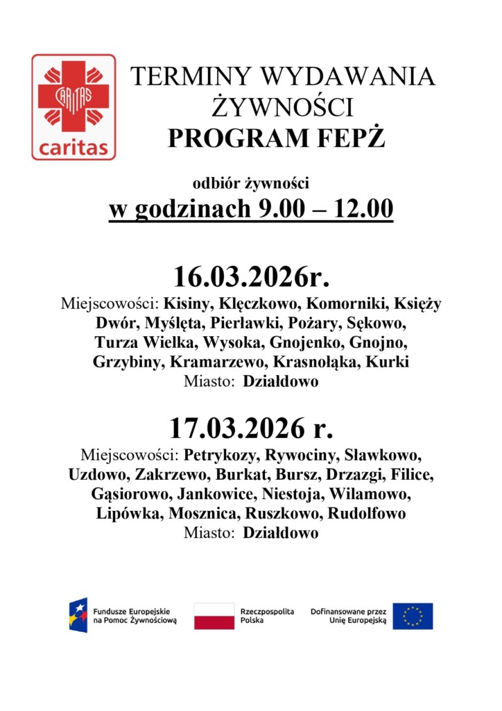 Dystrybucja żywności odbywać się będzie każdorazowo w siedzibie Działdowskiego Centrum Caritas w Działdowie przy ul. Księżodworskiej 23.